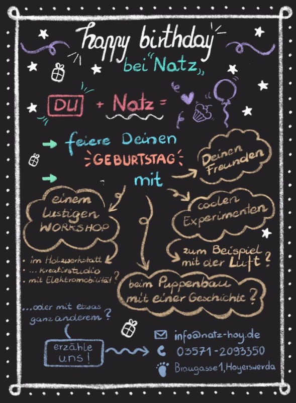 Wir bieten die Möglichkeit, dass du und deine Freunde zusammen im NATZ Geburtstag feiern könnt. Dabei darf natürlich das Geburtstagskind entscheiden, was gemacht wird. Bauen wir Insektenhotels in der Holzwerkstatt oder basteln wir lieber Puppen im Kreativbereich? Machen wir vielleicht sogar einen Abstecher in die Mineralogie? Das Angebot kann nach deinen Vorstellungen gestaltet werden und wird von unseren pädagogischen Mitarbeitenden begleitet.